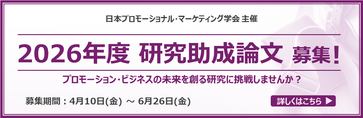 「2026年度 研究助成論文」募集!日本プロモーショナル・マーケティング学会委員会プロモーション・ビジネスの未来を創る意欲的な研究を応援します募集期間:4月10日(金)~6月26日(金)本年度で2... -
